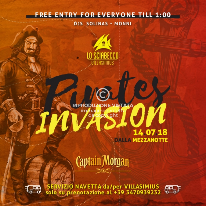 Sabato 14 luglio i pirati sbarcheranno nel nostro summer club per una serata di puro divertimento con spettacoli, giochi, premi e gadget per tutti! I djs Solinas e Monni vi faranno ballare per tutta la notte!